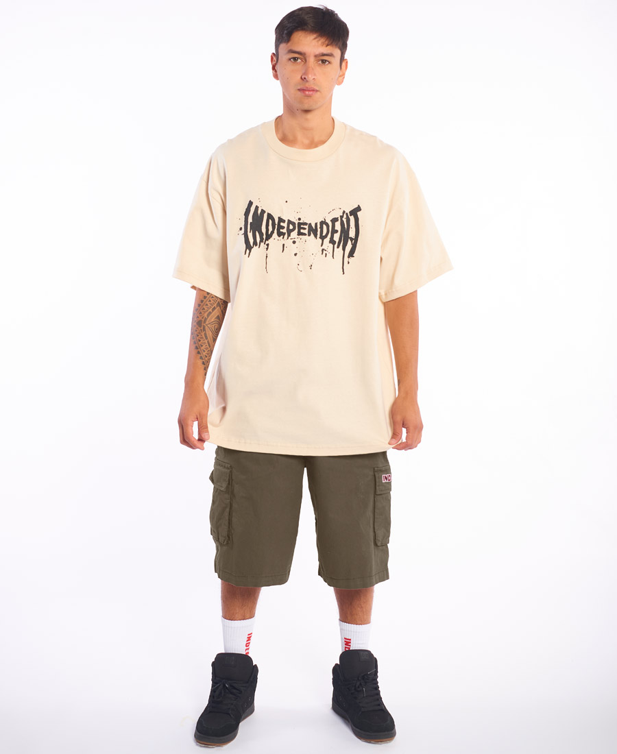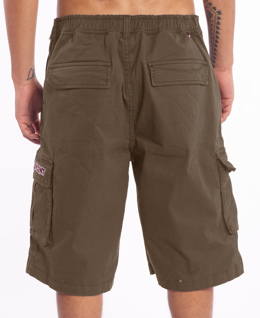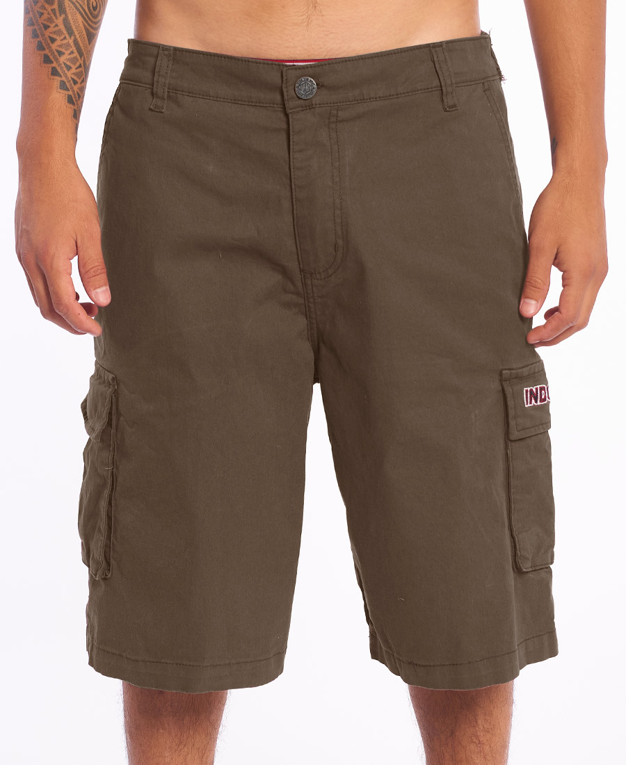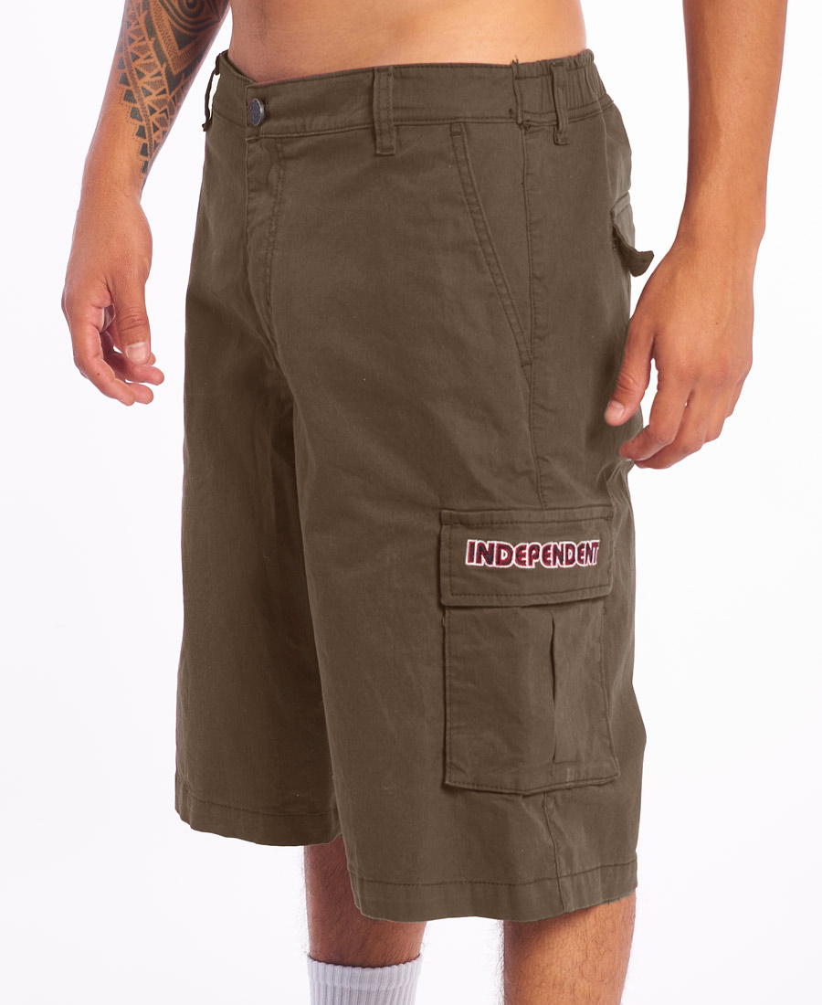 Bermuda Independent Groundwork. GABARDINA 7oz. 98% ALGODON 2% ELASTANO. LOOSE FIT 23”. Etiqueta de marca/talle. 5 bolsillos más bolsillos cargo en laterales.Cordón marcario con salida al lado interior de la prenda. Presillas de 2cm. Soft wash.Botón metálico marcario. Grifa de marca. Bordado en tapa de bolsillo cargo izquierdo.