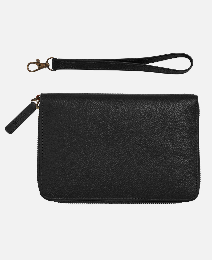 Esta Billetera grande está hecha de cuero vacuno curtido vegetal con múltiples ranuras para tarjetas compartimento para monedas espacio para billetes y protección RFID. Además cuenta con una correa de muñeca desmontable y un panel frontal grabado para un acabado surfero clásico.