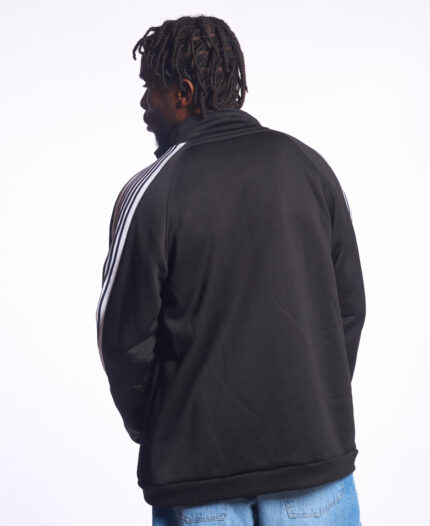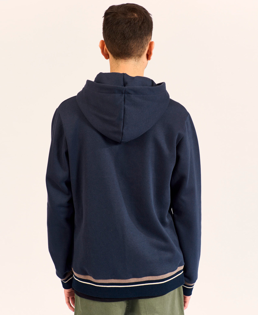 - Campera de frisa con capucha, recorte con vivo en frente y cierre.