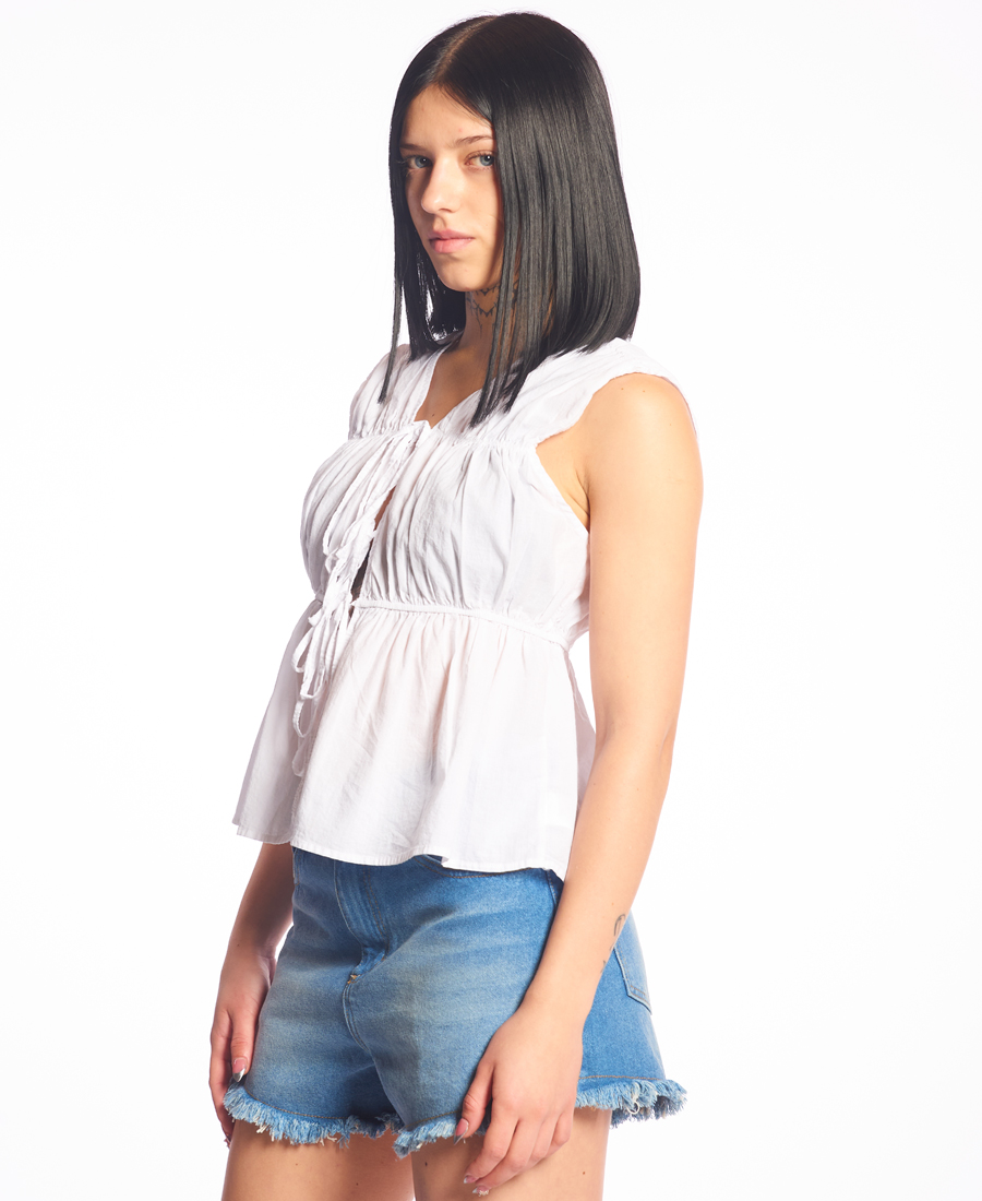 Camisa Isabel La Católica Cute CROP. Etiqueta Marca/talle. Fruncido con elasticos. Slim fit. acceso en frente con lazo. Hilo a tono. Grifa de marca