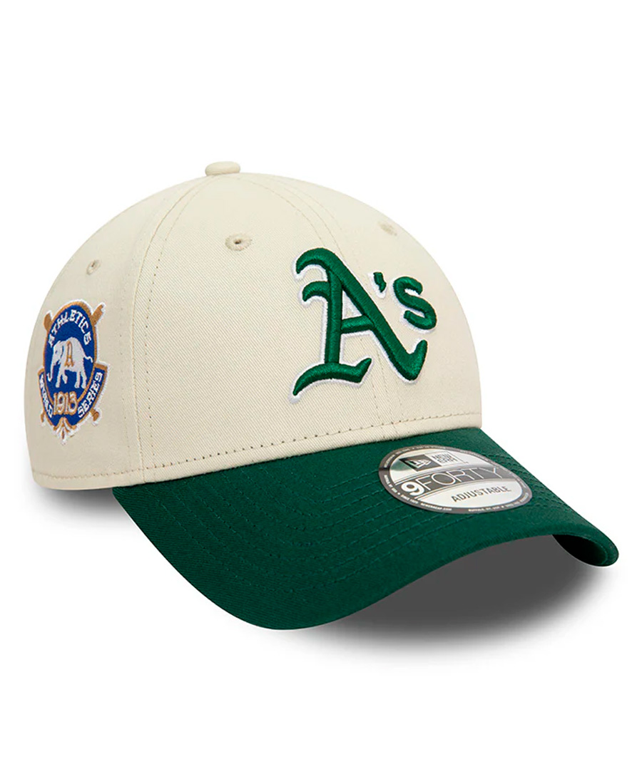 Cap New Era 9Forty Oakland Athletics. Esta gorra combina el estilo clásico de la liga con una paleta de colores crudo y verde que rinde homenaje al legado del equipo. Con el icónico logo “A’s” bordado al frente y un parche lateral esta gorra tiene visera curva estructura firme y ajuste trasero con hebilla metálica. Es cómoda canchera y perfecta para sumar actitud a cualquier outfit.
