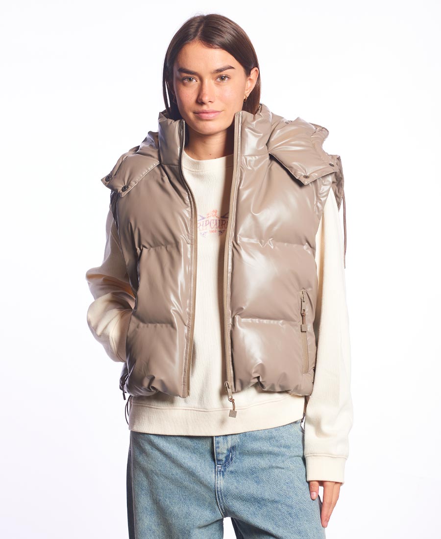 Chaleco Rip Curl Boxy SHINNY POLYESTER • Boxy fit • Puffer con capucha • Bolsillo delantero con cierre • Relleno acolchado • Tancas para regular • Cierre Frontal • Multietiquetas 100 % Poliester