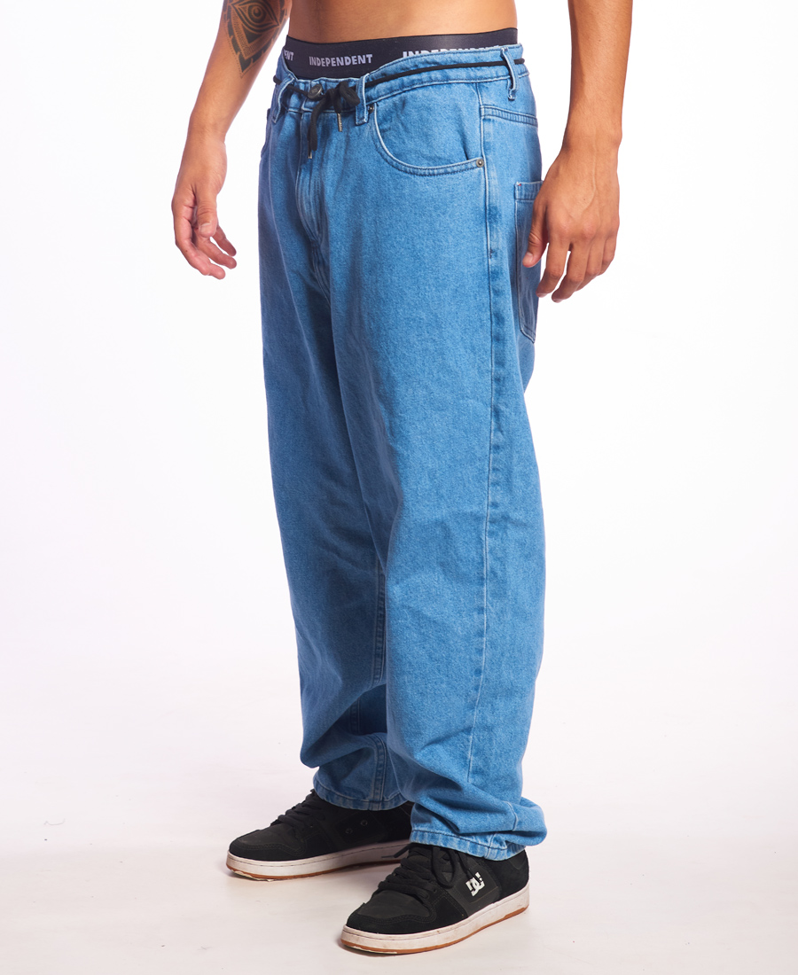Jean Independent Baggy Blue. Denim 12oz 100% algodon. Baggy fit. Stone wash. Cordón marcario. Ojales bordados contratono rojo. Costuras generales con hilo color crema. Botón metálico marcario. Remaches en bolsillos. Etiquetas marcarias.