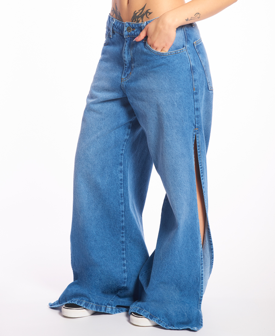 Jean Isabel La Católica Wide Tajo WIDE FIT. Etiqueta Marca/talle. Lavado localizado bigotes. Tajos en lateral Hilo Camel. Grifa de marca