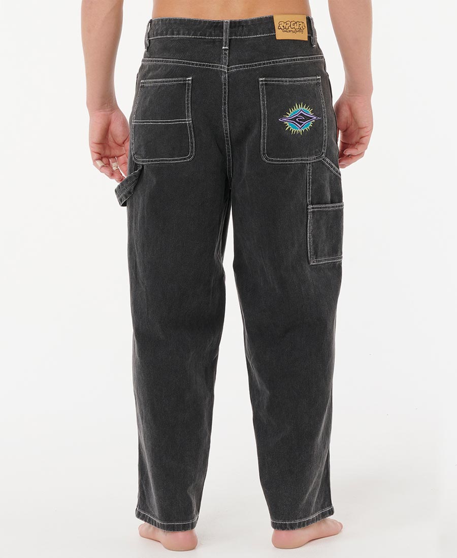 JeanRip Curl Baggy Carpenter Energy. Denim black 10oz. Baggy fit. Lavado Stone Black Wash + teñido. Multibordados. Etiqueta tejida. Bolsillo carpintero. Hammer loop. Metales plata vieja. 100% Algodon.