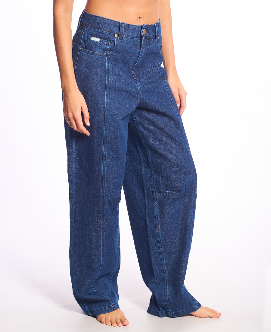 JeanRip Curl Ballon Blue. Denim rígido azul 10oz. Balloon fit. Tiro Mid. Lavado bajada de color. Bigotes láser. Avios metalicos oro. Multietiquetas. 100% algodón.