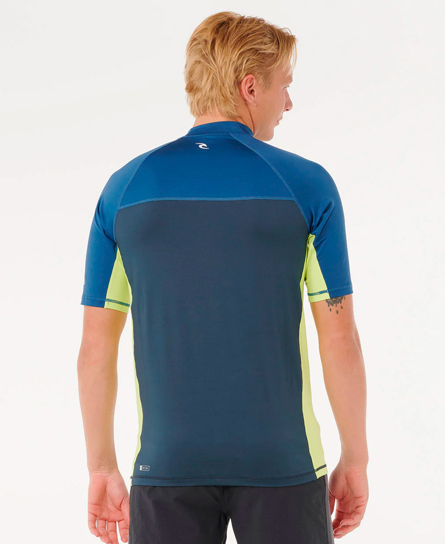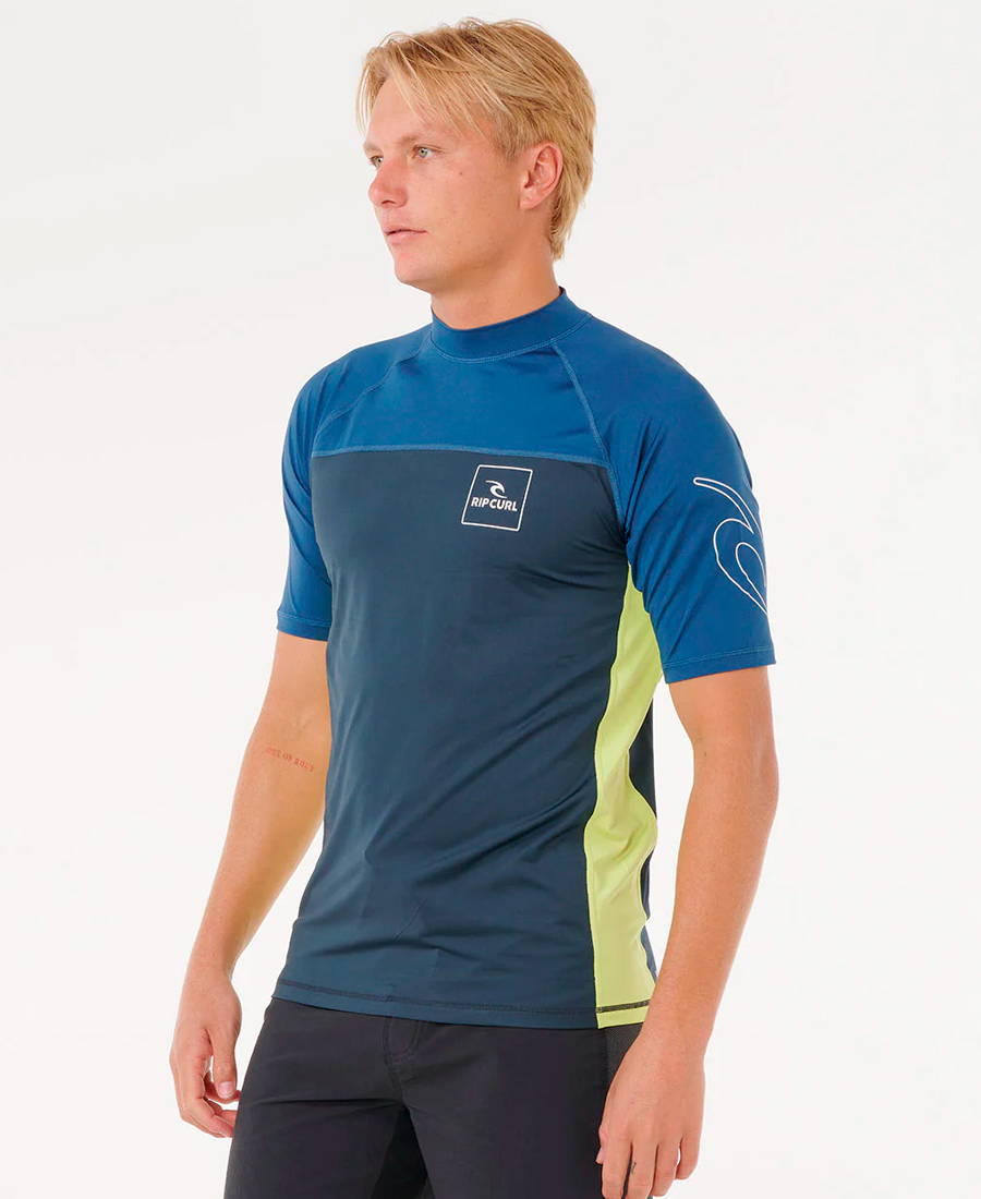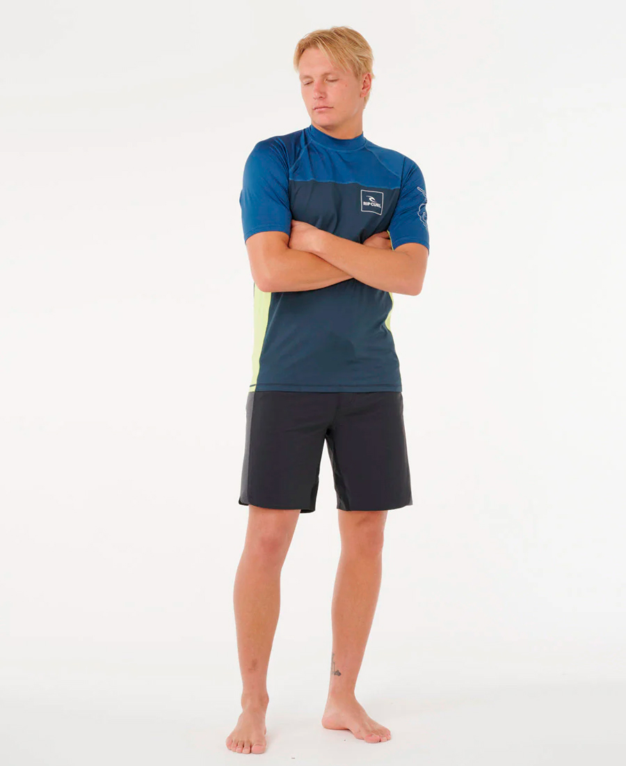 LycraRip Curl Drive UV50. STRETCH RECYCLED POLYESTER 180G. RELAXED FIT. Transferencia térmica. Estampado frontal y en las mangas. Detalles con costura flatlock. Elástico para boardshorts. Rash vest con protección solar UPF 50+. Resistente al cloro. Producido de manera responsable. 100% Poly.