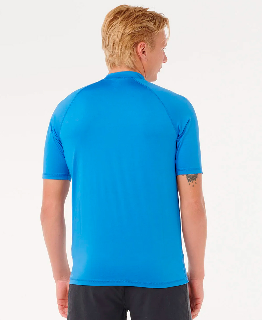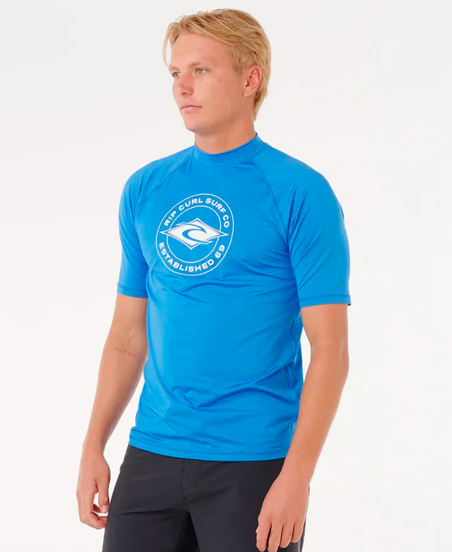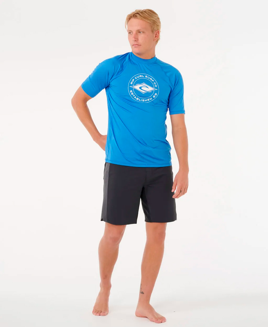 Lycra Rip Curl Stapler UV50.STRETCH RECYCLED POLYESTER 180G. RELAXED FIT. Transferencia térmica. Estampado frontal y en las mangas. Detalles con costura flatlock. Elástico para boardshorts. Rash vest con protección solar UPF 50+. Resistente al cloro. Producido de manera responsable. 100% Poly.