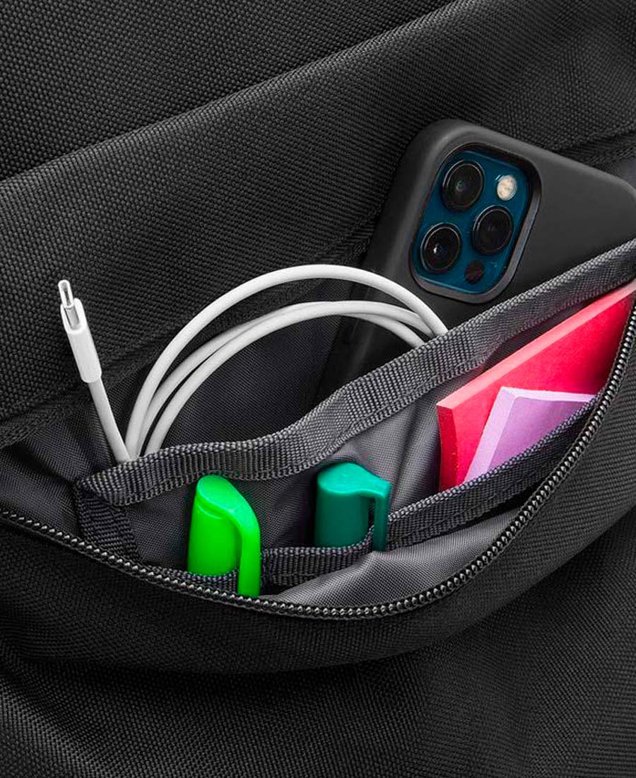 - Compartimento de entrada frontal inferior con cremallera clip interno para llaves y soporte para accesorios