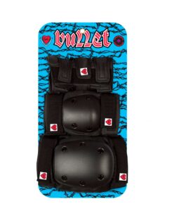 Protecciones Bullet Tripack para adultos. Plástico ABS de diseño moderno y actualizadas. Material exterior de pana de nailon resistente y duradero. Espuma interna de alta densidad absorbente de impactos. Correas de tensión suaves con cierres de velcro para un ajuste personalizado.