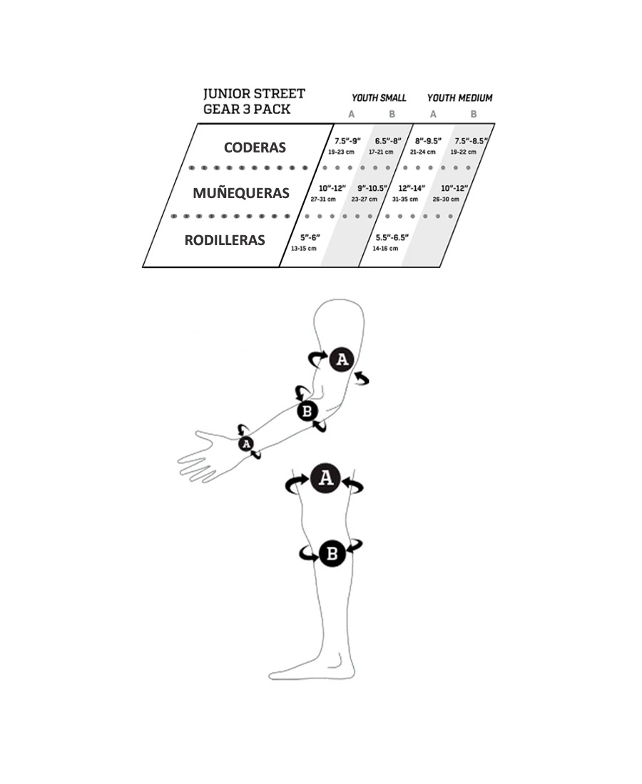 Protecciones para niños Pro Tec Street Gear 3 PackJr. El juego de protecciones fue diseñado y fabricado con nailon resistente a la abrasión tapas de plástico duraderas paneles elásticos de neopreno y un cómodo acolchado de EVA. Cuentan con un sistema de cierre de velcro. El juego viene en una bolsa de malla reutilizable para mantenerlos juntos cuando no se usan. Además se reduce el desperdicio de embalaje lo que beneficia al medio ambiente.