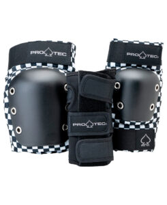 ProteccionesPro Tec Street Gear 3 Pack. El juego de protecciones fue diseñado y fabricado con nailon resistente a la abrasión tapas de plástico duraderas paneles elásticos de neopreno y un cómodo acolchado de EVA. Cuentan con un sistema de cierre de velcro. El juego viene en una bolsa de malla reutilizable para mantenerlos juntos cuando no se usan. Además se reduce el desperdicio de embalaje lo que beneficia al medio ambiente.