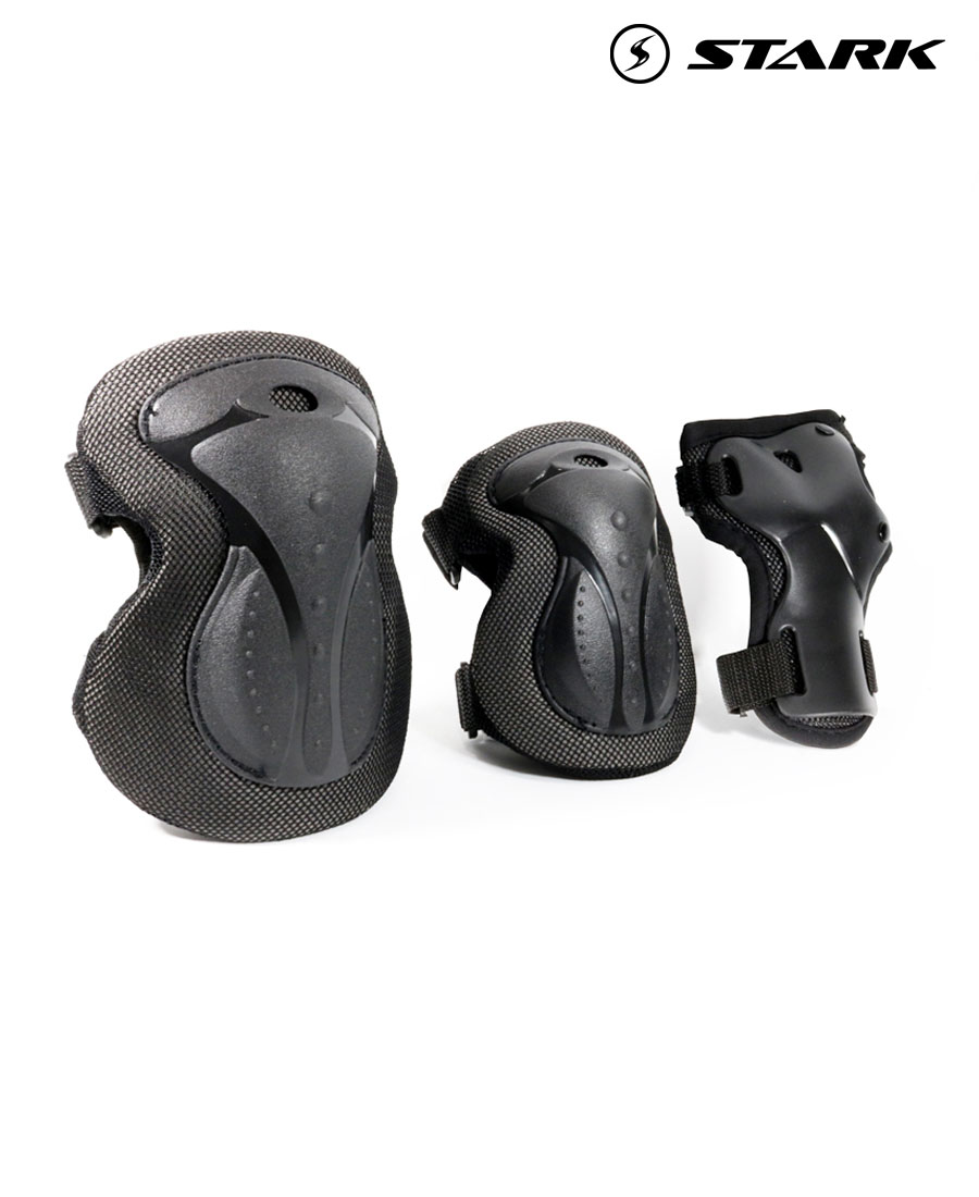 Protecciones Stark Set. Material poliuretano. Ajustable con velcro. El set contiene muñequeras coderas y rodilleras. Para niños de 8 a 16 años.
