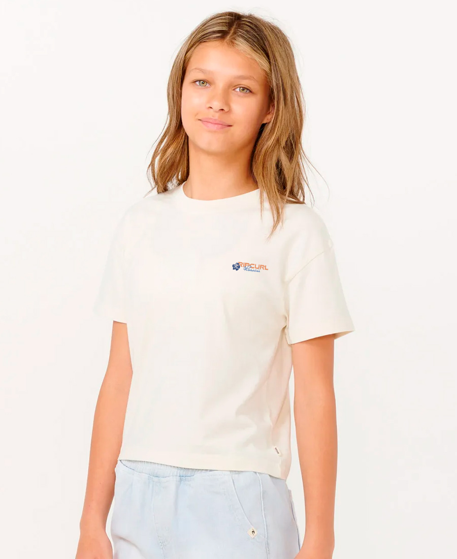 RemeraRip Curl Crop Dune Dancer. JERSEY 24/1. Cropped fit. Estampa interna talle + marca. Tirillera de hombro a hombro. Estampa Frente + Espalda. Multietiquetas. 100% algodón.