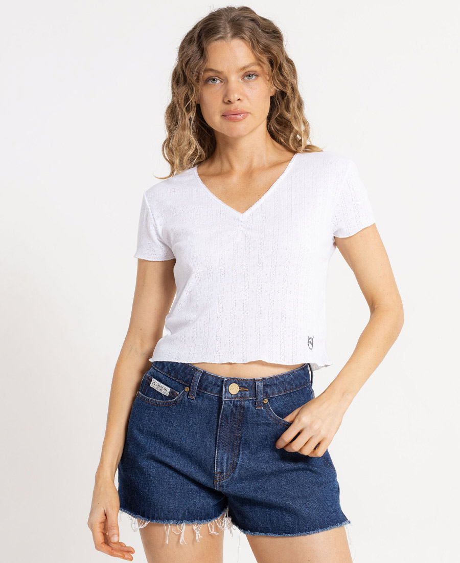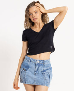 Remera Rusty Polly Anna. Tejido jersey desagujado. Composición 100% algodón. Calce baby fit. Remera escote semi V entallada con frunce en delantero jersey desagujado. Origen nacional.