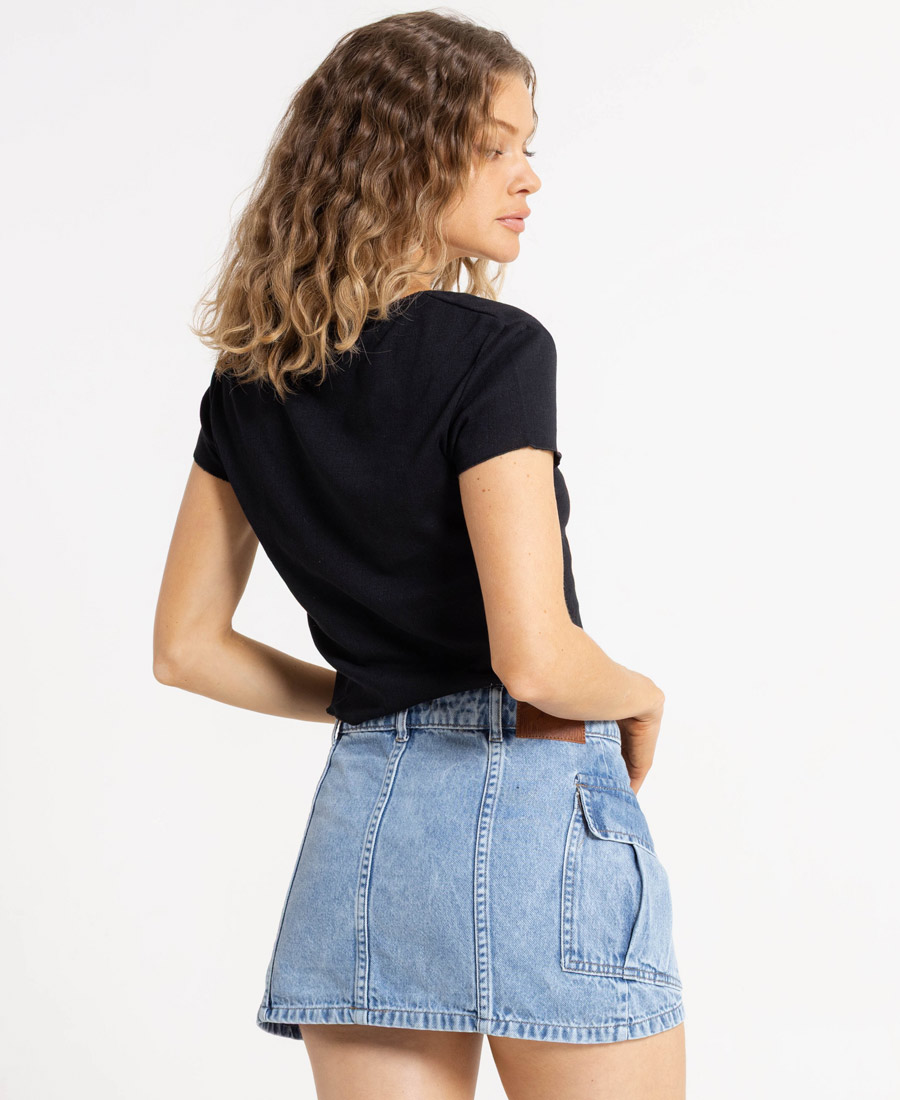 Remera Rusty Polly Anna. Tejido jersey desagujado. Composición 100% algodón. Calce baby fit. Remera escote semi V entallada con frunce en delantero jersey desagujado. Origen nacional.
