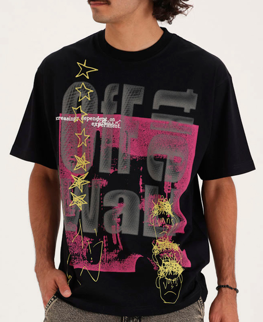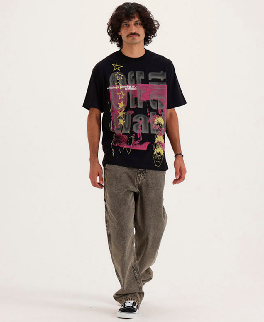 - Su diseño de manga corta suma un gráfico frontal en capas que reinterpreta la tipografía icónica de la marca con un enfoque visual contemporáneo, ideal para completar un look urbano con identidad propia.