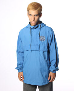 Anorak de taslom 100% nylon estampa transfer en espalda y delantero bolsillos en recortes delanteros capucha con cordones marcarios.
