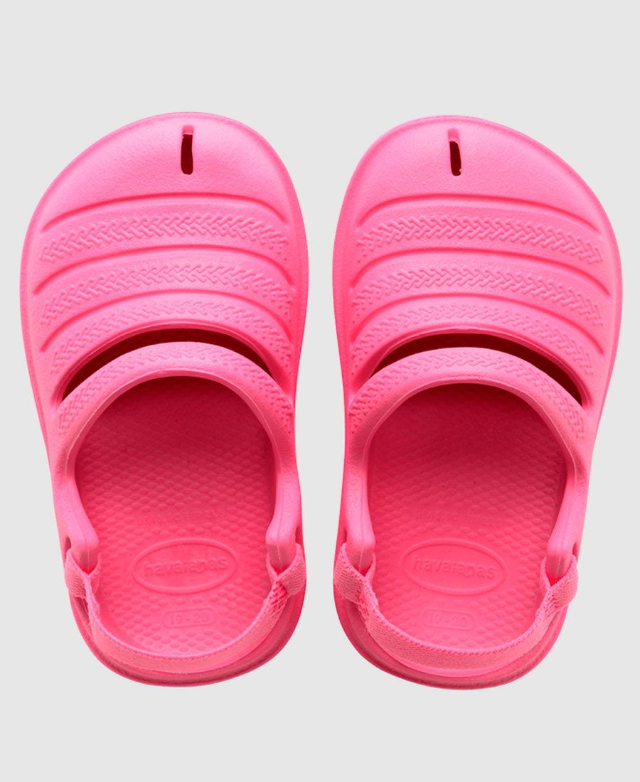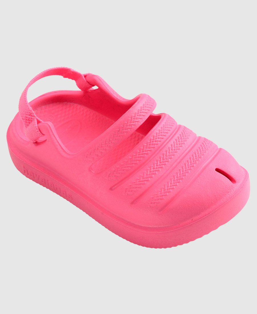 Suecos Havaianas Baby Clog.Este modelo para bebé tiene todo el estilo de Havaianas. La parte superior tiene tiras y en el talón tiene el tradicional elástico para que no se resbale del pie. ¡Práctico y muy bonito!