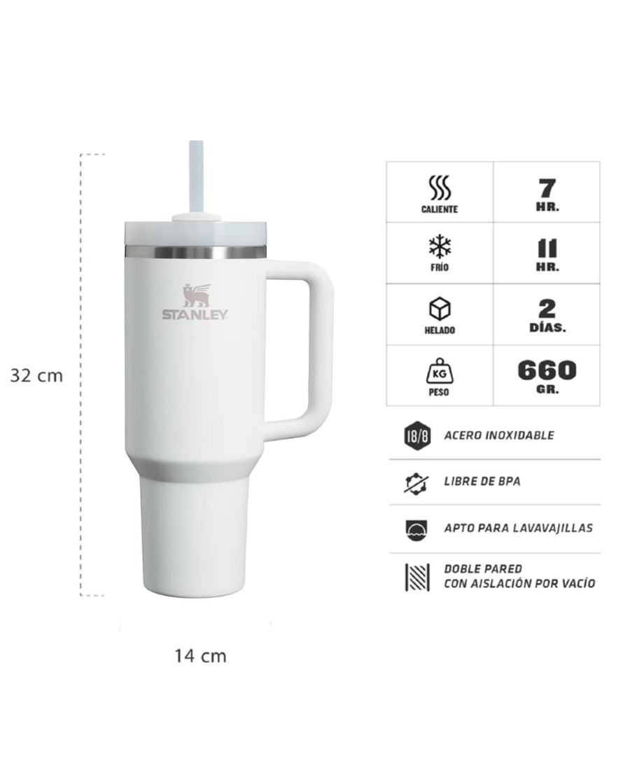 Vaso Stanley Quencher 1.18 Lts. Construido con acero inoxidable nuestro vaso Quencher ofrece la máxima hidratación con menos recargas. Al ir al trabajo al entrenamiento o a las excursiones de un día querrás tener este vaso a tu lado. Gracias al aislamiento al vacío de Stanley tus bebidas se mantendrán heladas hora tras hora. La tapa FlowState™ avanzada cuenta con una cubierta giratoria con tres posiciones: una abertura diseñada para resistir las salpicaduras mientras mantiene el sorbete en su lugar una abertura para beber y una tapa de cobertura completa. El asa ergonómica incluye inserciones de agarre cómodo para transportarlo con facilidad y la base angosta se adapta a casi cualquier portavasos de vehículo.