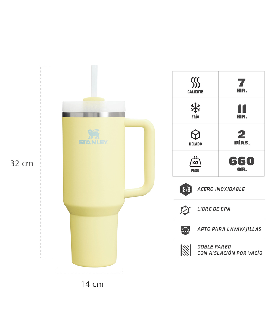 Vaso Stanley Quencher 1.18 Lts. Construido con acero inoxidable nuestro vaso Quencher ofrece la máxima hidratación con menos recargas. Al ir al trabajo al entrenamiento o a las excursiones de un día querrás tener este vaso a tu lado. Gracias al aislamiento al vacío de Stanley tus bebidas se mantendrán heladas hora tras hora. La tapa FlowState™ avanzada cuenta con una cubierta giratoria con tres posiciones: una abertura diseñada para resistir las salpicaduras mientras mantiene el sorbete en su lugar una abertura para beber y una tapa de cobertura completa. El asa ergonómica incluye inserciones de agarre cómodo para transportarlo con facilidad y la base angosta se adapta a casi cualquier portavasos de vehículo.