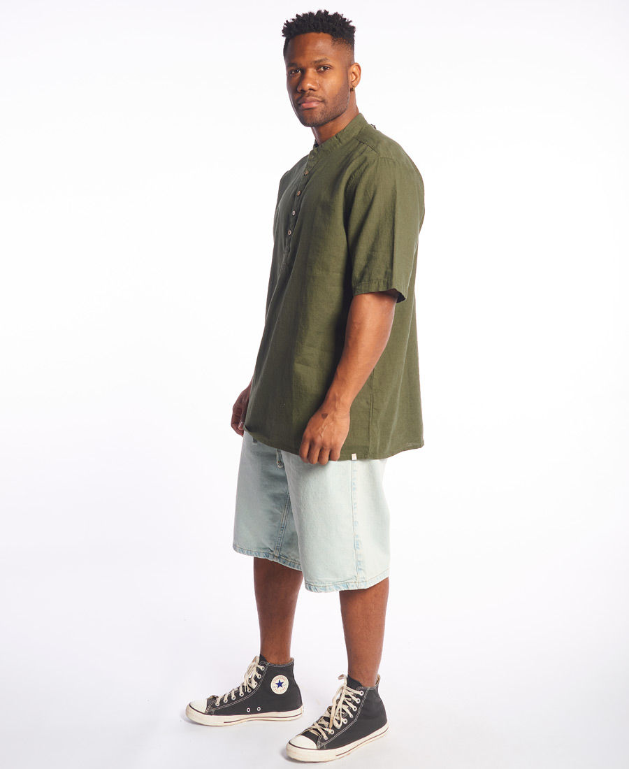 Camisa Y Tu Quique? Boxy Mao. Lino 45% lino 55% algodon. Etiqueta marcaria. Lavado suavizado. Cartera Henley. Botones de coco. Grifa de marca. Regular FIT.