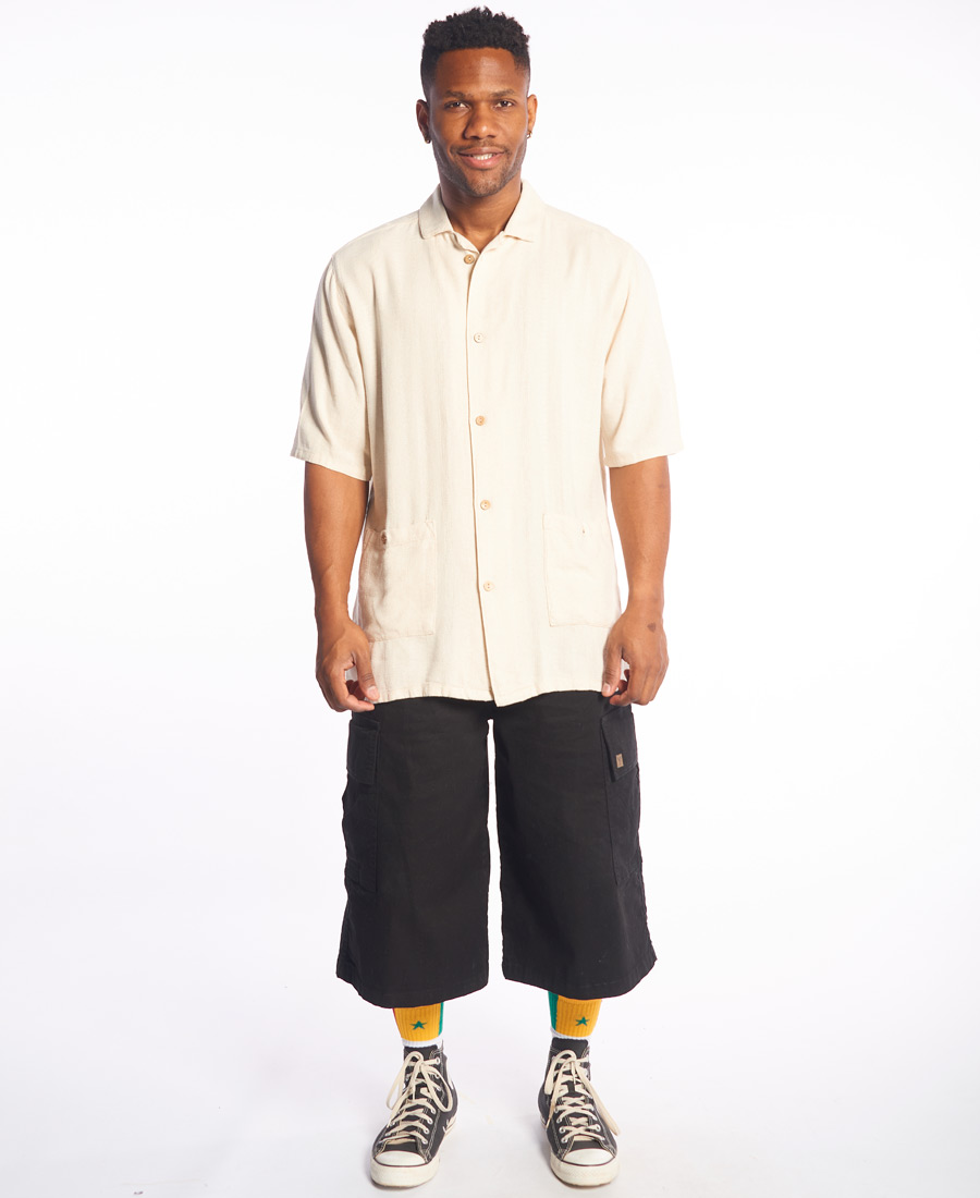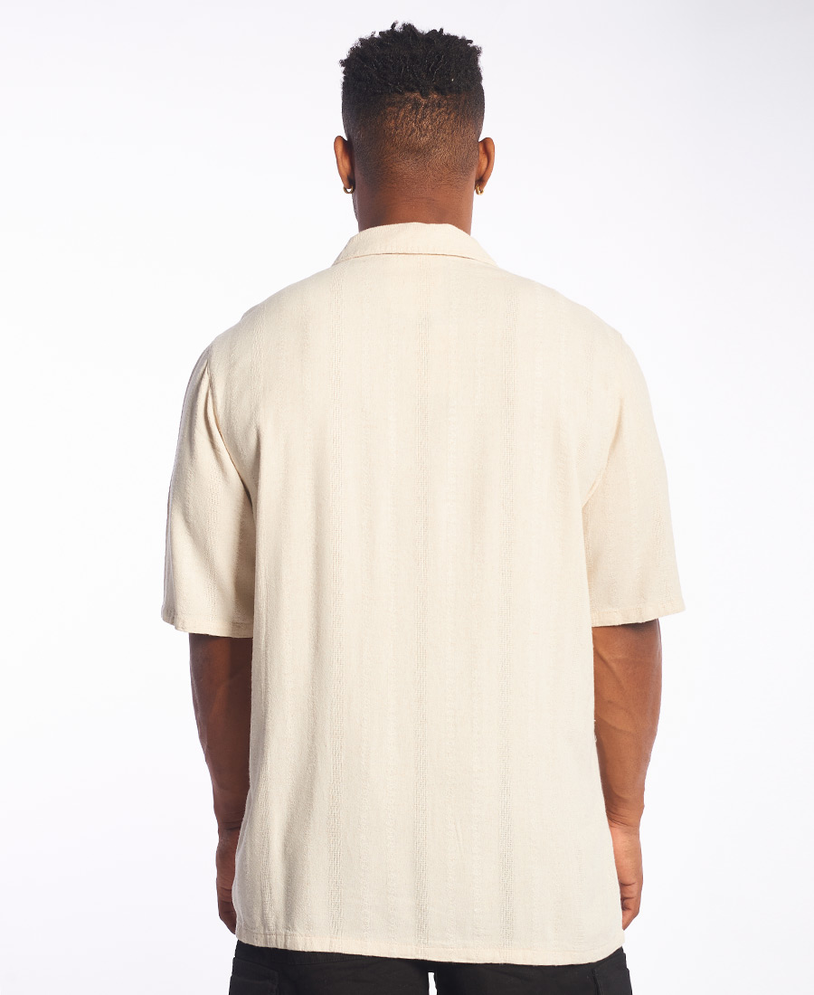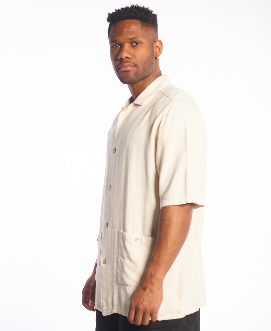 Camisa Y Tú Quique? Boxy Guayaberá. RATTIER LINO CASCARILLA 85% viscosa 13% Lino 2% algodon. Back interno con etiqueta. Bolsillo aplicado. Lavado suavizado. Estampa serigráfica al agua. Botones de coco. Grifa de marca. Regular FIT.