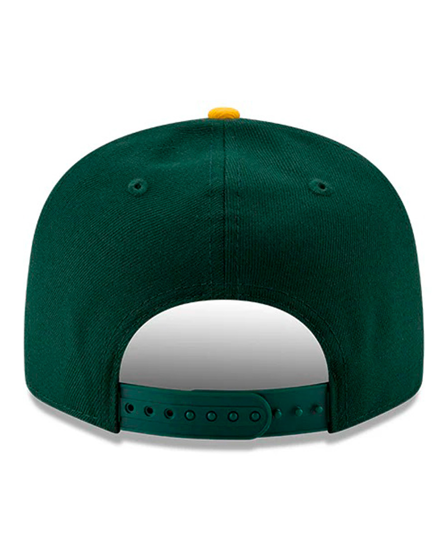 Cap New Era 9Fifty Oakland Athletics MLB - SEASONAL COLLECTION. Esta gorra ajustable presenta visera plana rígida en vibrante color amarillo dorado que contrasta perfectamente con la corona verde, construcción de corona estructurada en verde característico de los Athletics que mantiene la forma profesional, logo A's bordado en blanco sobre la parte frontal con detalles precisos que replican el diseño oficial del equipo, botón superior en verde que complementa la combinación bicolor distintiva, interior con banda antitranspirante para comodidad durante uso prolongado, y sistema de ajuste snapback trasero con botones a presión que permite fit personalizado desde 54cm hasta 62cm. La colección "Seasonal" resalta la legendaria combinación verde y amarillo que ha definido la identidad visual de los Oakland Athletics desde su llegada a California en 1968.