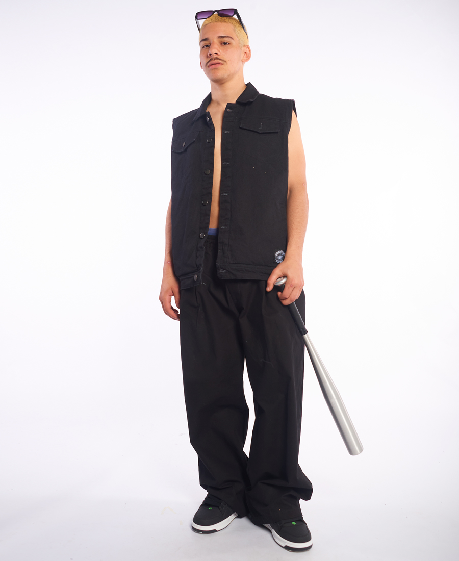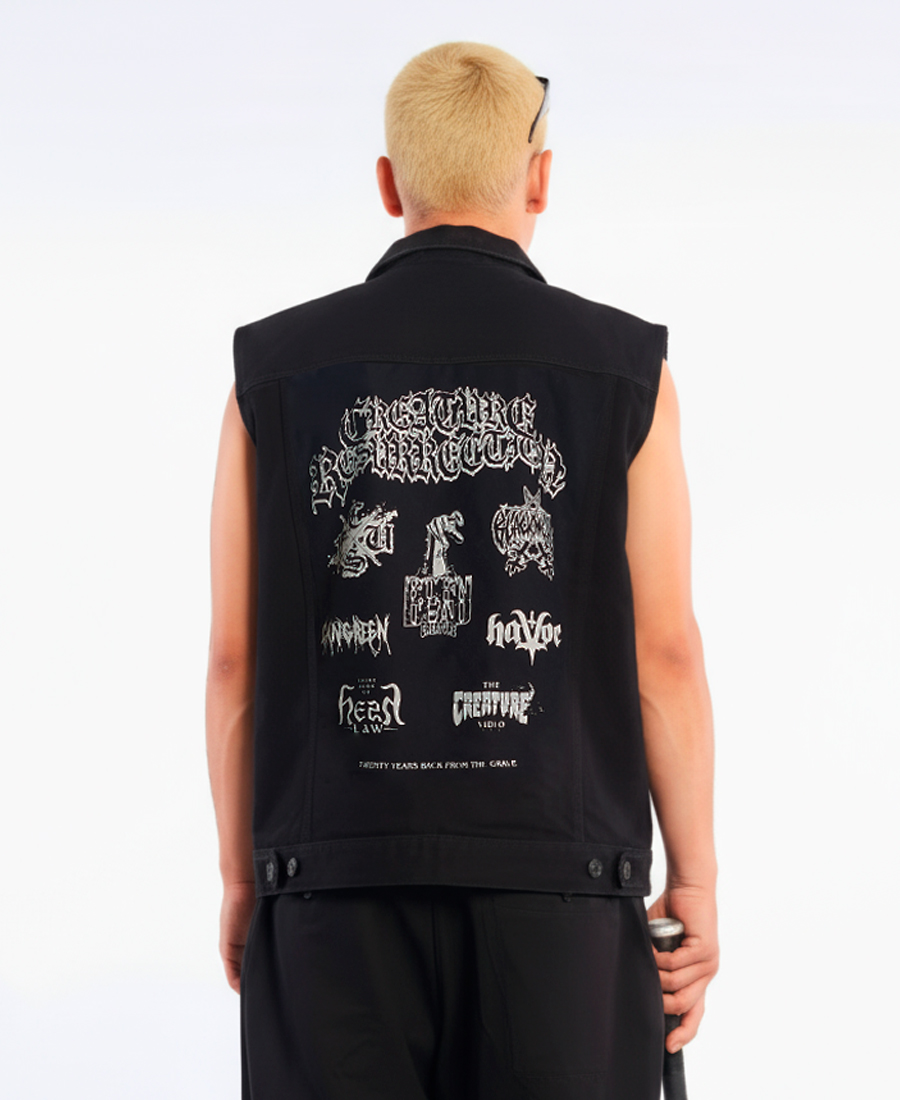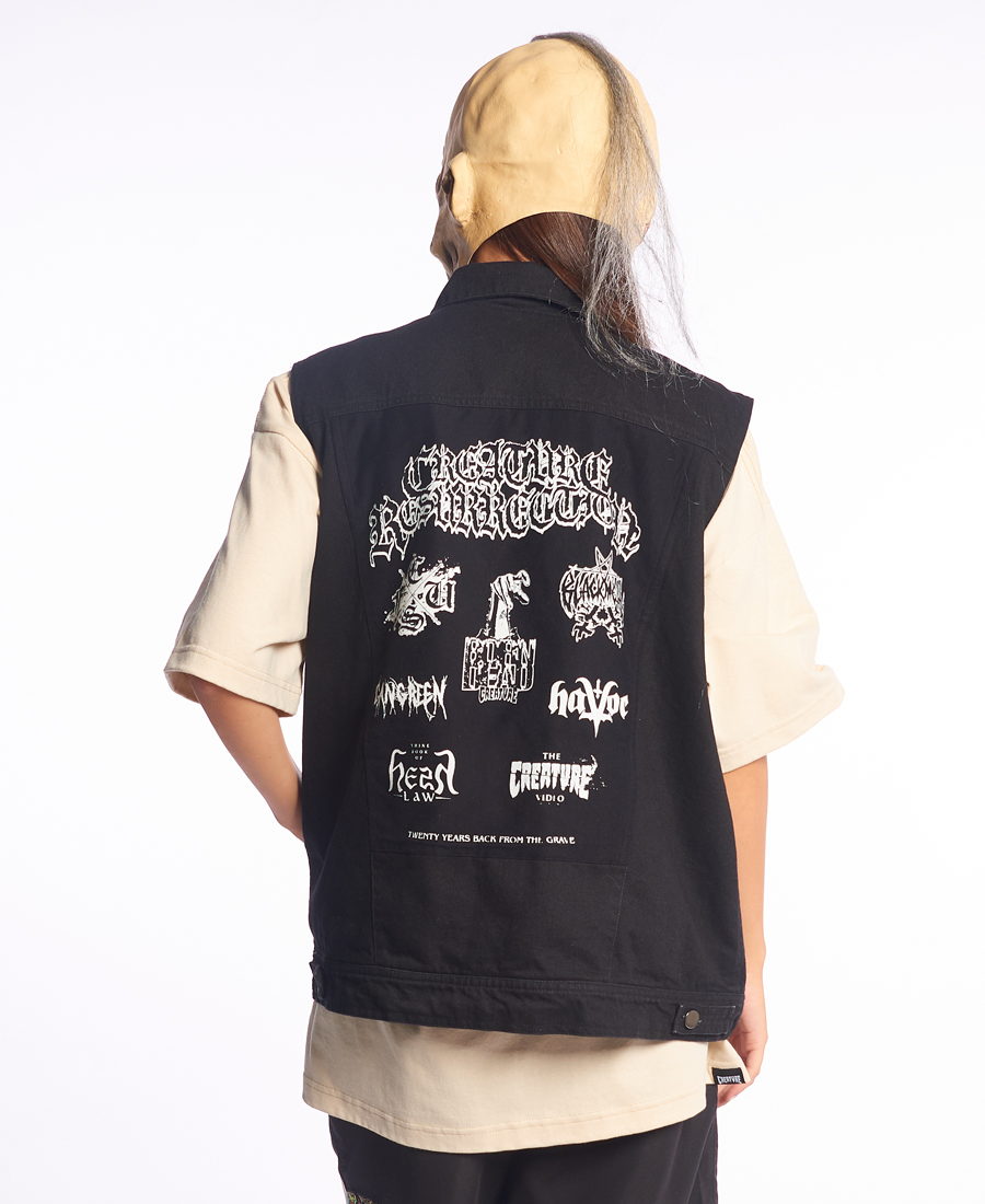 Chaleco Creature Resurrection. DENIM 10,8oz BLACK. 100% ALGODON. RELAXED FIT. Bolsillos jeaneros. Bolsillo interior. Forreria flannel matelaceada. Estampa en espalda sobre paño al corte. Botones metálicos de denim. Grifa de marca.